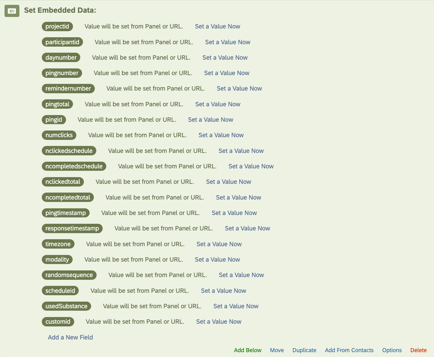 Add all survey parameters sent by Inclivio, leaving the value as the default ('Value will be set from Panel or URL'). Select 'Move' at the bottom of this box and move the bedded data to the top of your survey flow, which will allow you to use these values to control the flow of your survey.